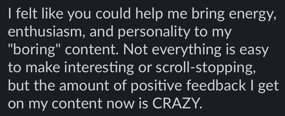 You'll get real-time support & accountability while you execute the content we planned. Each week, you’ll submit your content for review to get my feedback and learn the how/why behind every tweak so you build the skill and confidence to create on your own.