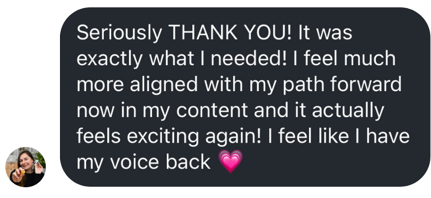 You have a bold perspective and a ton of depth!! But turning it into content that says what you mean in a way that resonates with your audience is where you freeze. You’re not short on ideas… you just need support translating them into mic-drop, impact-driven, “needed to hear this” content.
