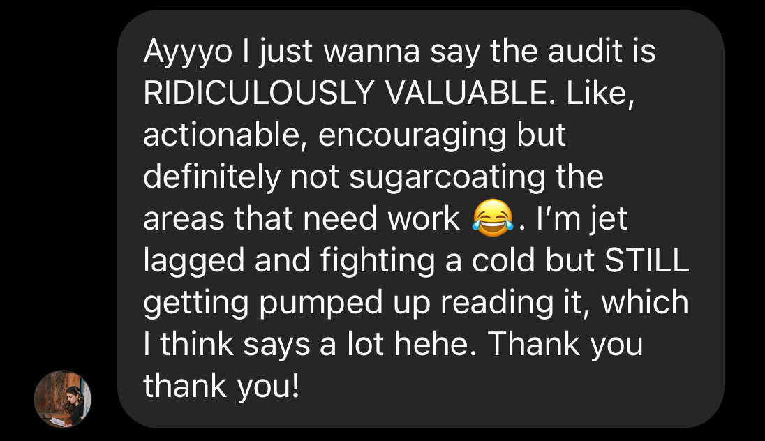 As a cucumber!! You will absolutely be able to book a 1:1 call with me once you receive your audit to integrate, brainstorm, and get all your burning content questions answered! (it’ll be $300!)