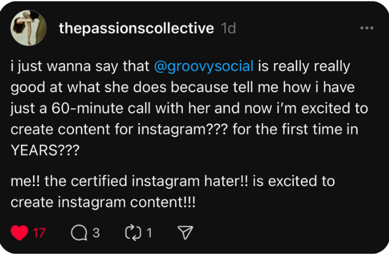“Working with Groovy Social is like chatting with a best friend who also happens to be an Instagram whiz. You’ll feel safe enough to be vulnerable, but fired up enough to make the changes.”